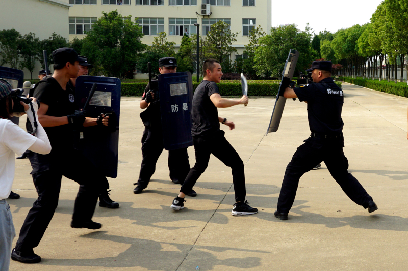 接警后,孝南公安分局巡邏大隊(duì)、治安大隊(duì)和南大派出所組織了16名警察和特勤隊(duì)員荷槍實(shí)彈趕到現(xiàn)場,并在現(xiàn)場指揮員的果斷指揮下迅速完成外圍監(jiān)守布防和內(nèi)線包圍突進(jìn),不到一分鐘就奪下兇器,干凈利落地將“暴恐分子”制服收押。