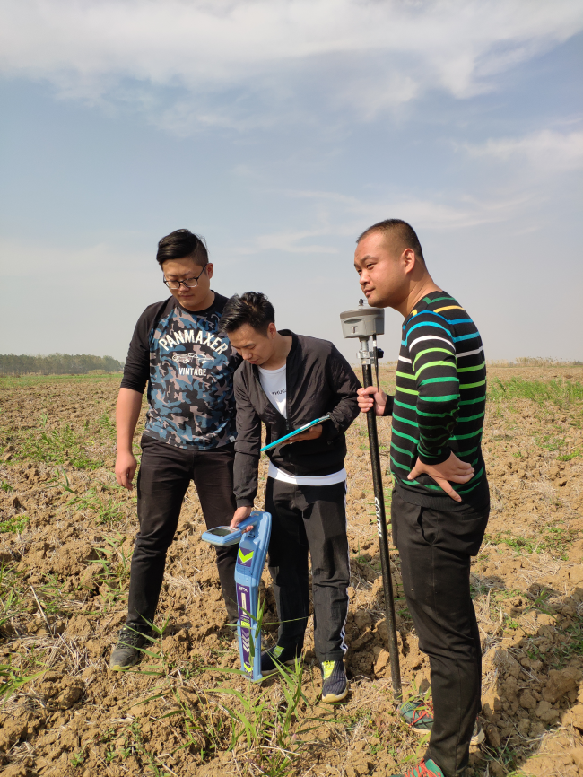 上午8時整,專班的 3名小伙子已經(jīng)打理調(diào)試好巡線儀、GPS定位儀、平板電腦、標(biāo)志彩旗等裝備,拎上幾瓶水就驅(qū)車啟程了。將近一個小時的車程里,他們也沒耽擱,結(jié)合地形圖一路商量著現(xiàn)場測量方案。9時許,一行人順利抵達漢北河段第一個測量點。時節(jié)已是深秋,現(xiàn)場滿眼望去,大片荒頹的田野上盡是半米高的雜草、灌木,沒有一絲供水設(shè)施的影跡,看上去幾乎無從著手。跟我們一臉茫然不同,小伙子們顯然很有經(jīng)驗,他們說首先得找到閘閥的位置,閘閥的兩端自然就是源水管線,由點及線,測量才好向下一步開展。但在這片荒野地上尋找一個閘閥,難度當(dāng)然也不小。小伙子們明確分工,分別拿上儀器、彩旗一路排開,向堤內(nèi)田野間開進。在儀器的輔助下,他們順利識破了雜草的“偽裝”,找到了第一個閘閥,有條不紊地對閘閥進行定位、測定坐標(biāo),并認真細致地在數(shù)字地形圖上標(biāo)定標(biāo)點。接下來,就是以閘閥為工作點,向兩端輻射查找和測量輸水管線了;然后就進入下一個測量點,接著重復(fù)這一套“標(biāo)準(zhǔn)動作”。