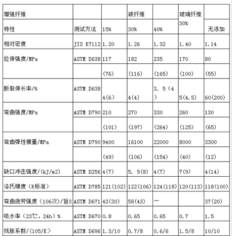 根據(jù)碳纖維長(zhǎng)度、表面處理方式及用量的不同,還可以制備綜合性能優(yōu)異、導(dǎo)電性能各異的導(dǎo)電材料,如抗靜電材料、電磁屏蔽材料、面狀發(fā)熱體材料、電極材料等。碳纖維增強(qiáng)尼龍材料近年來(lái)發(fā)展很快,因?yàn)槟猃埡吞祭w維都是各自領(lǐng)域性能優(yōu)異的材料,其復(fù)合材料綜合體現(xiàn)了二者的優(yōu)越性,強(qiáng)度與剛性比未增強(qiáng)的尼龍高很多,高溫蠕變小,熱穩(wěn)定性顯著提高,尺寸精度好,耐磨,阻尼性優(yōu)良,與玻纖增強(qiáng)尼龍相比有更好的綜合性能,如表所示。