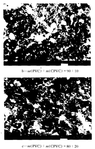 結果表明,在有機錫穩定劑的作用下,當 (PVC): (CPVC)從1O0:0向70:30變化時,隨著CPVC含量的增多,pvc/CPVC二元合金體系的拉伸強度、沖擊強度、斷裂伸長率均呈現先下降后上升的趨勢;而彎曲強度卻與之相反,出現先上升后下降的趨勢。兩種趨勢在(PVC):(CPVC)=80:20時出現拐點,此時體系的沖擊強度和斷裂伸長率都下降到單用PVC時的50% ,拉伸強度也只有原來的93%,而彎曲強度卻提高了5%。除此之外,隨著共混比中CPVC含量的增加,體系的熱變形溫度不斷升高,(PVC):(CPVC)=70:30時,在不同彎曲正應力(1.82MPa和0.45 MPa)下,熱變形溫度較PVC分別增加1.3 ℃ 和5.6℃。