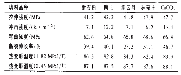 從表3可以看出:PVC/CPVC合金體系的拉伸強度以選用硅藻土和活性CaCO3時較大,分別為47.9MPa和47.7 MPa,沖擊強度則是選用活性CaCO~和陶土時較大,分別為14.4 kJ/m2和12.2 kJ/m2。在采用活性CaCO3時,試樣的斷裂伸長率也達到較大,為46.7%。由于填料的使用量小,填料品種對PVC/CPVC合金體系的彎曲強度和熱變形溫度影響不大。